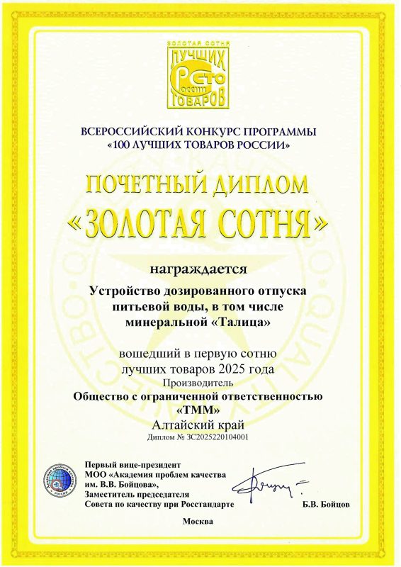 Также компания ООО «ТММ» была награждена специальными дипломами — «Золотые бренды Алтая» за неоднократное присуждение лауреата конкурса на протяжении трех лет подряд и «Золотая Сотня» за вхождение в первую сотню лучших товаров 2025 года во Всероссийской Программе «100 лучших товаров России».