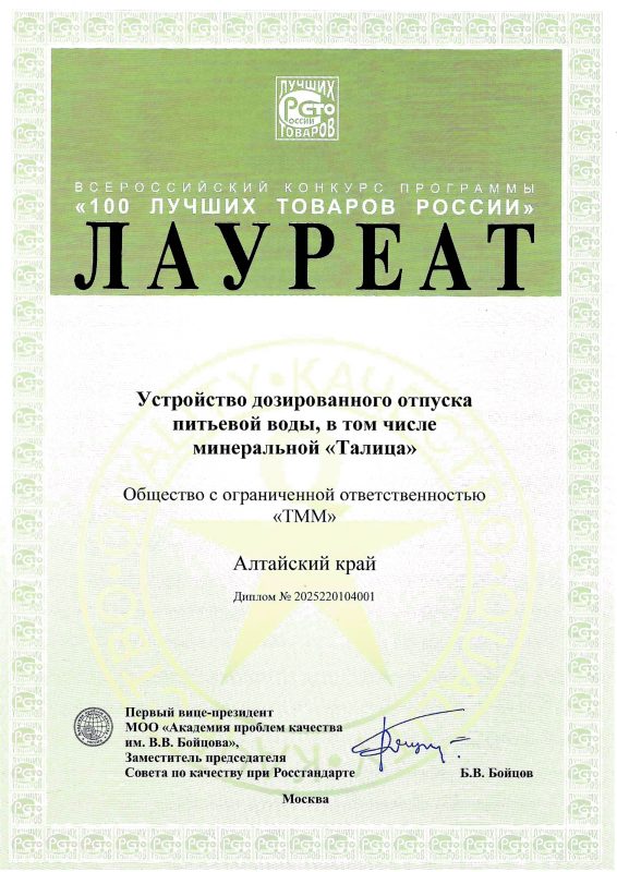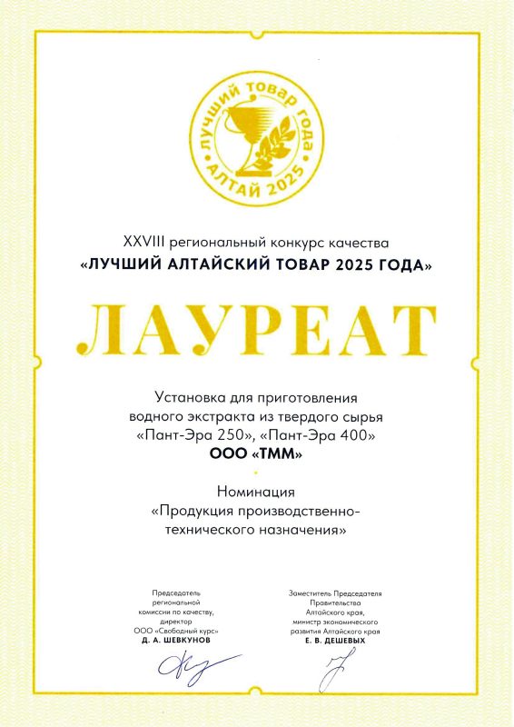 Компания ООО «ТММ» в этом году представила на конкурс два изделия — установку для приготовления водного экстракта из пантового сырья «Пант-Эра» и устройство дозированного отпуска питьевой воды, в том числе минеральной «Талица». Оба изделия удостоились звания Лауреата регионального конкурса «Лучший товар Алтая 2025 года» в номинации «Продукты производственно-технического назначения».